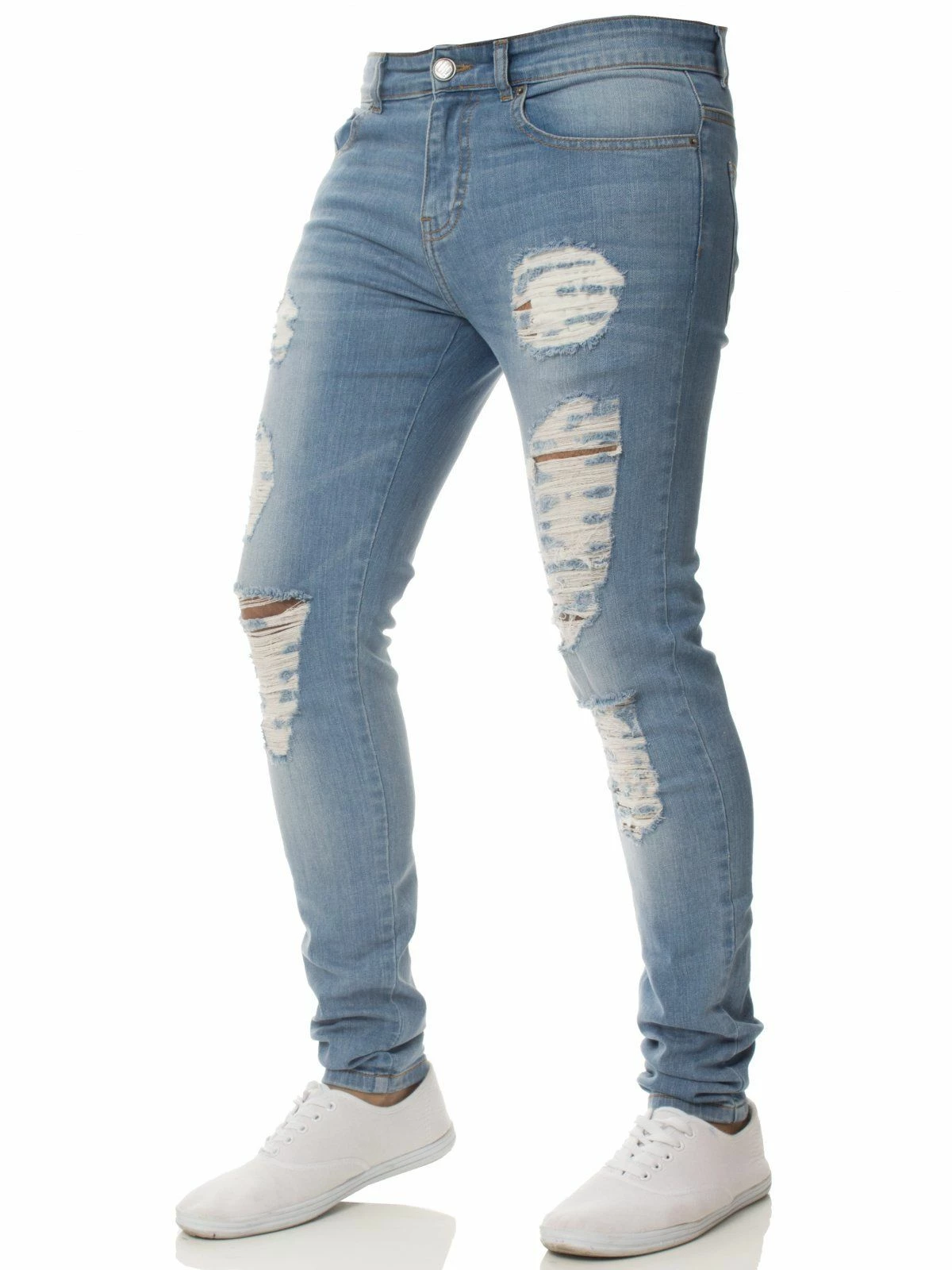 Capture a crisp, clean look this season with Enzo mens super skinny jeans in light stonewash stretch denim. These super skinny men’s jeans are tight from thigh to ankle for a contemporary look. With zip fly, silver button, belt loops at the waist and leather logo. Crafted from soft, natural cotton with a little stretch for ease of movement; the streamlined silhouette of these mens designer jeans will bring an urban look to your wardrobe whether for summer or winter. Available in blue, black and grey.