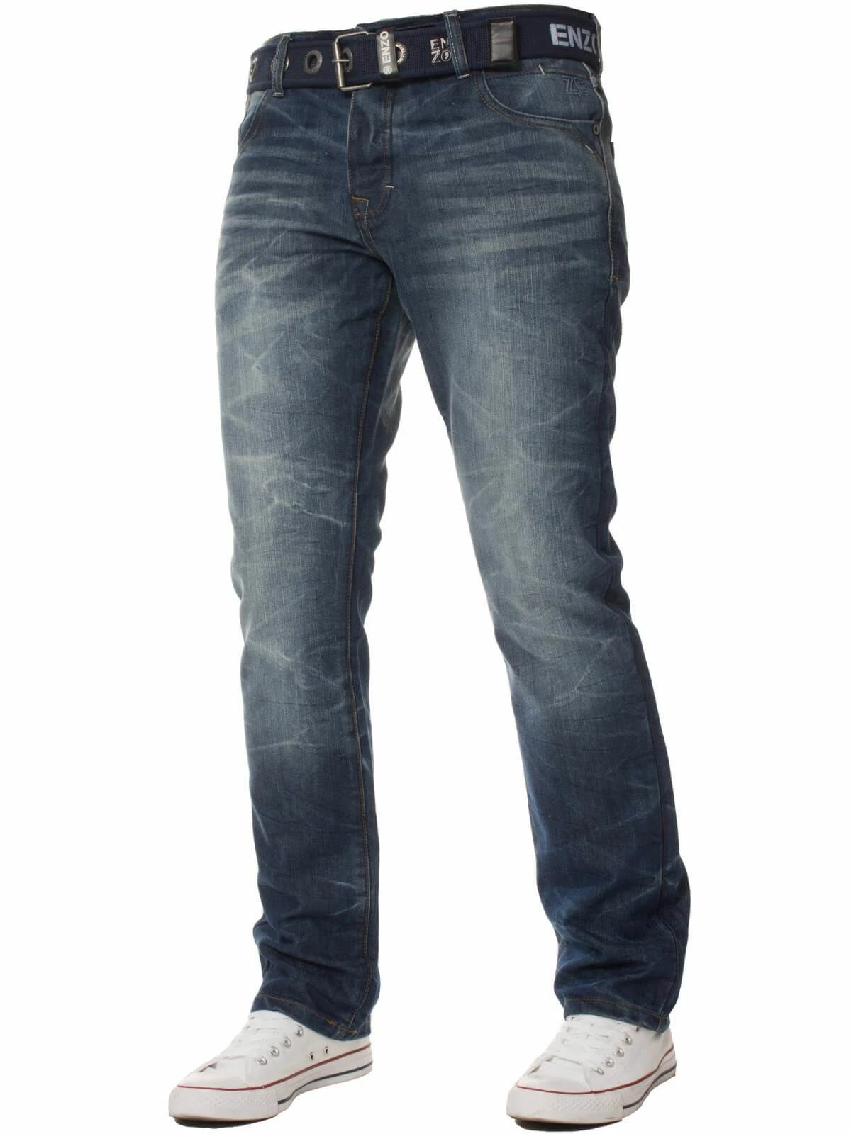 Crafted from hardwearing denim in a goes-with-everything dark stonewash blue, these mens jeans are a real wardrobe staple. These regular cut men’s jeans sit low on the hip and are the same width all the way through the leg. Featuring zip fly, belt loops and embroidered Enzo jeans logo on the back pocket. Straight leg jeans are a classic style that suits almost everybody and with a range of three different leg lengths and waist sizes from 28 up to 60, theres a pair waiting for you.