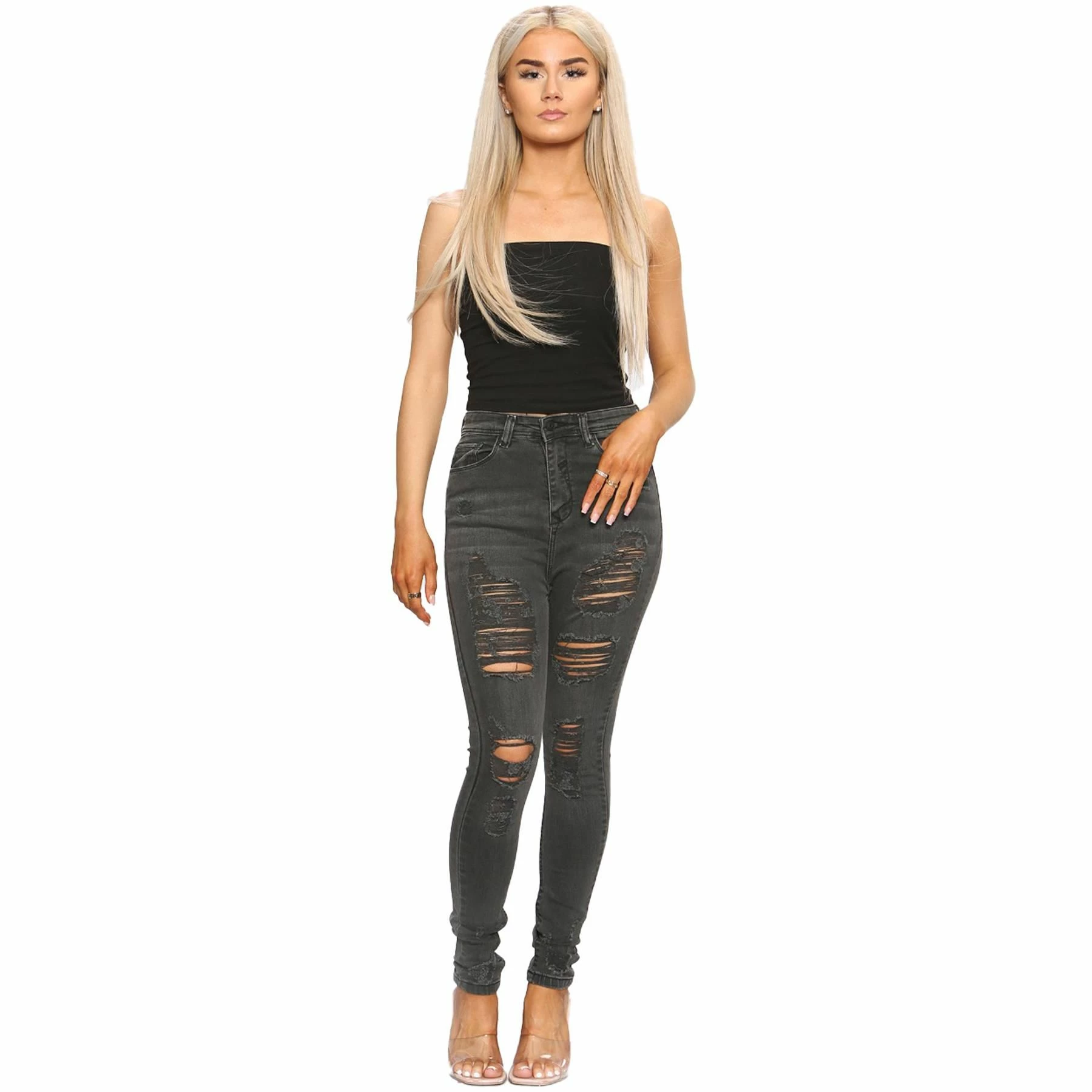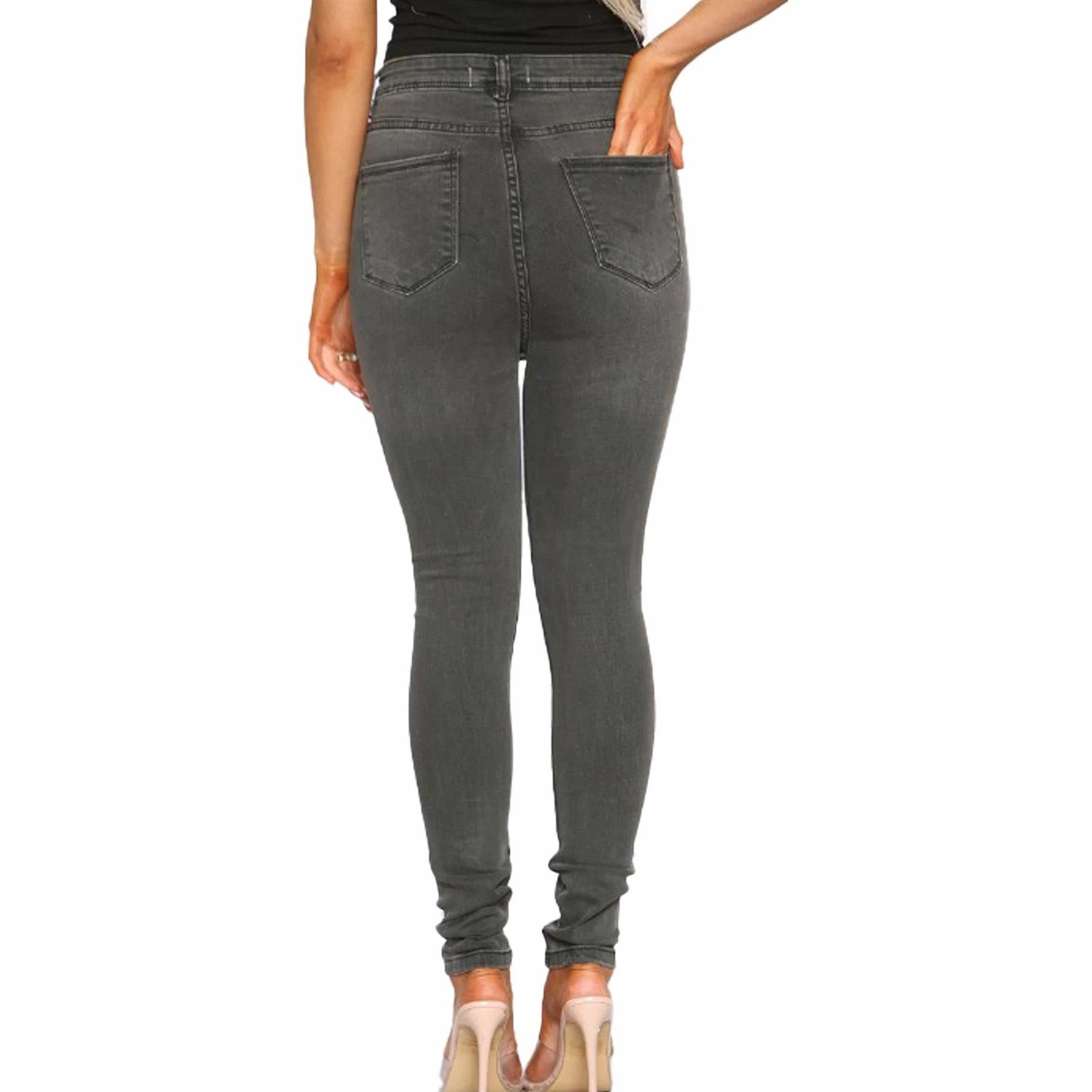 Enzo Womens Skinny Denim High Rise Jeans With Ripped Detail and Button and Zip Fastening Made From 98% Cotton, 2% Elastane, Featuring 2 Front Pockets, 2 Back Pockets and 1 Coin Pocket
