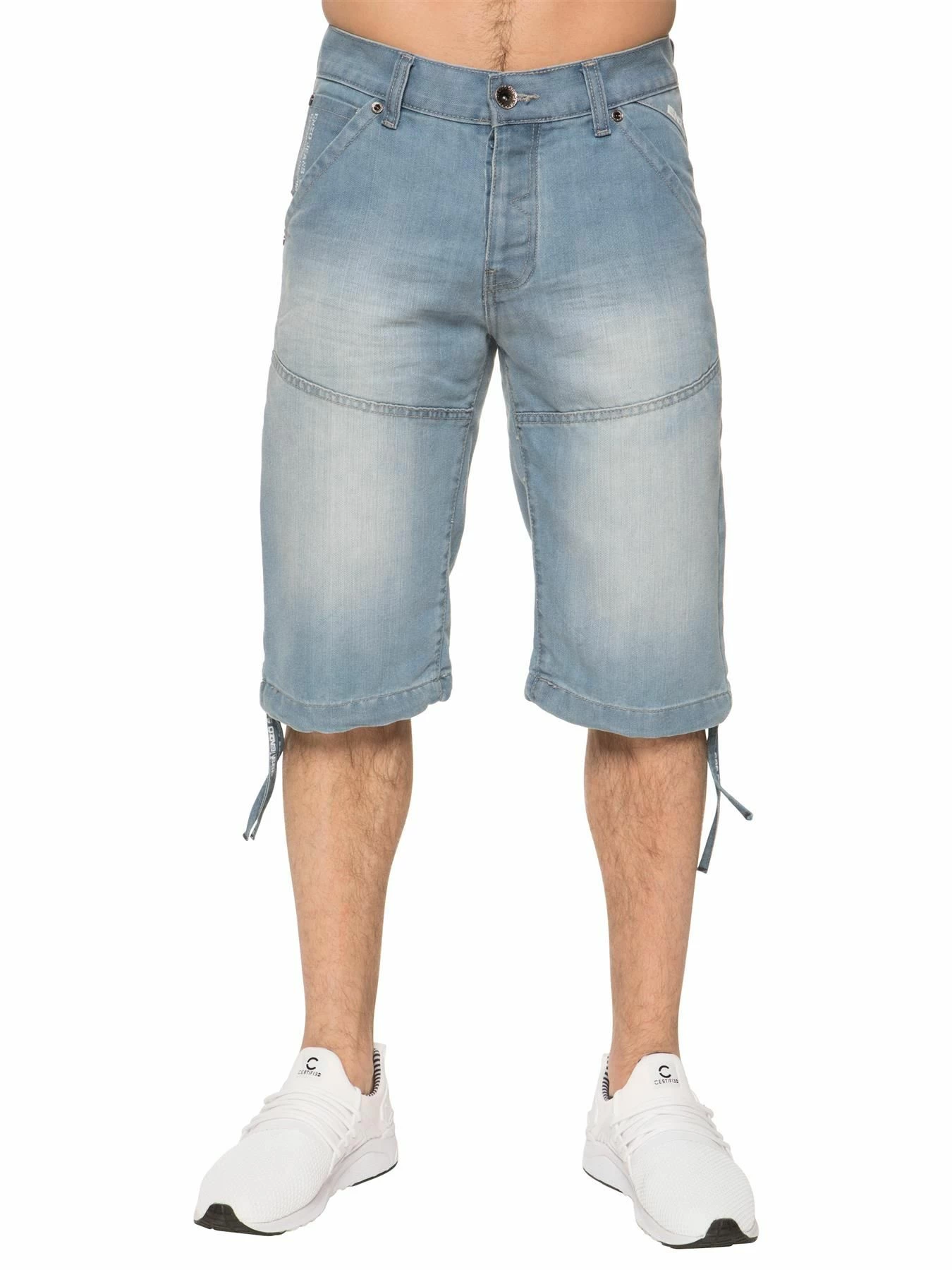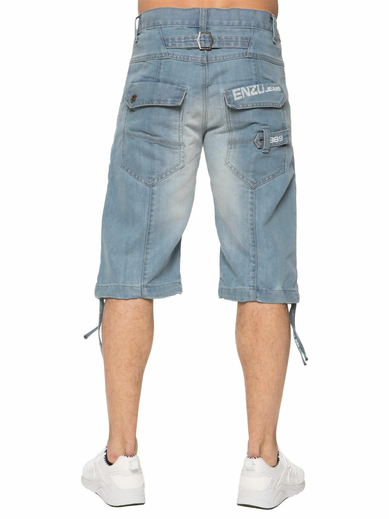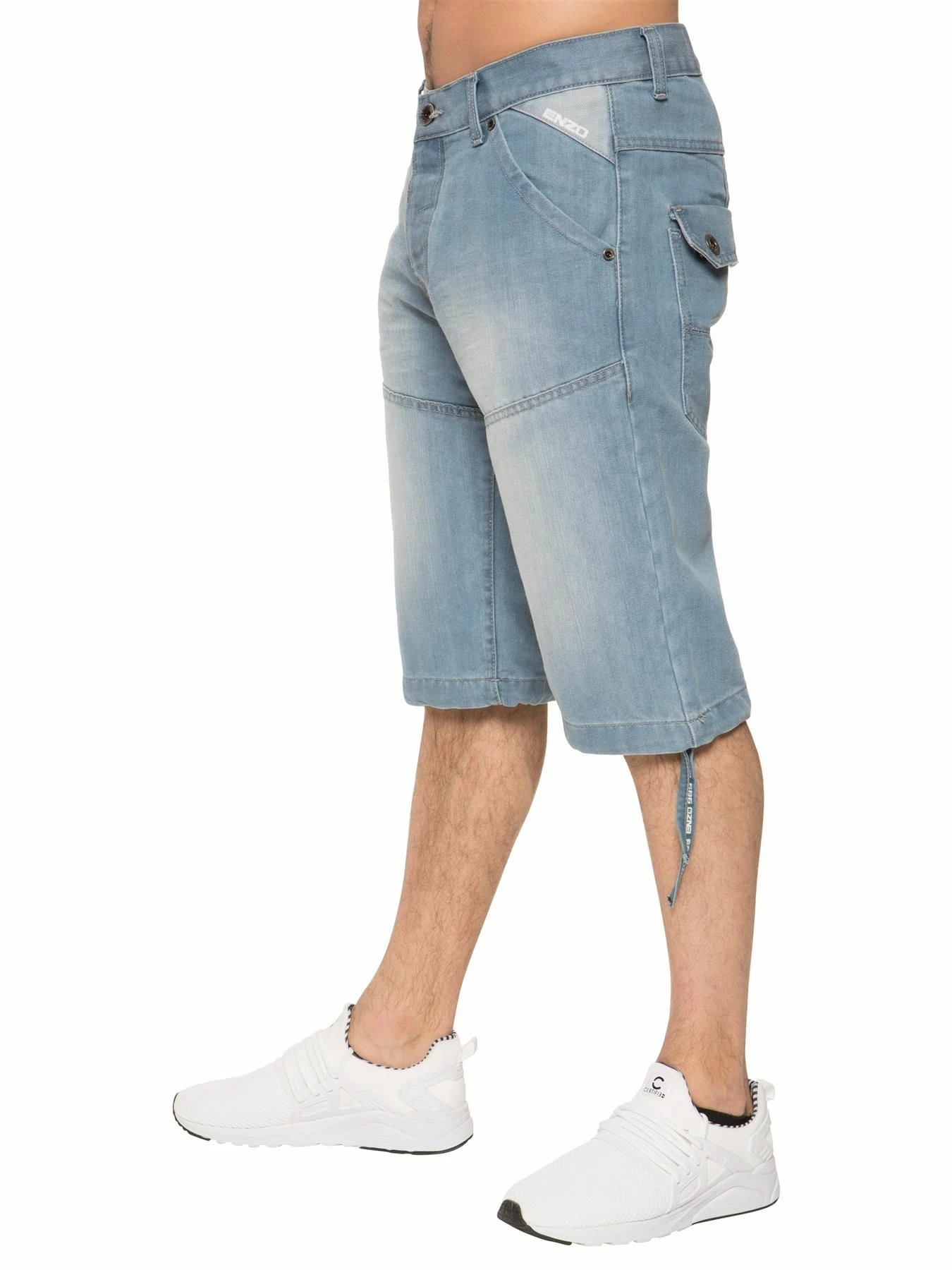Enzo Mens Designer Knee Length Denim Shorts In Sky Blue, 2 Front Pockets, 2 Back Pockets, Button fly fastening, 65% Cotton, 35% Polyester, Machine washable, Ideal for Casual Occasions.