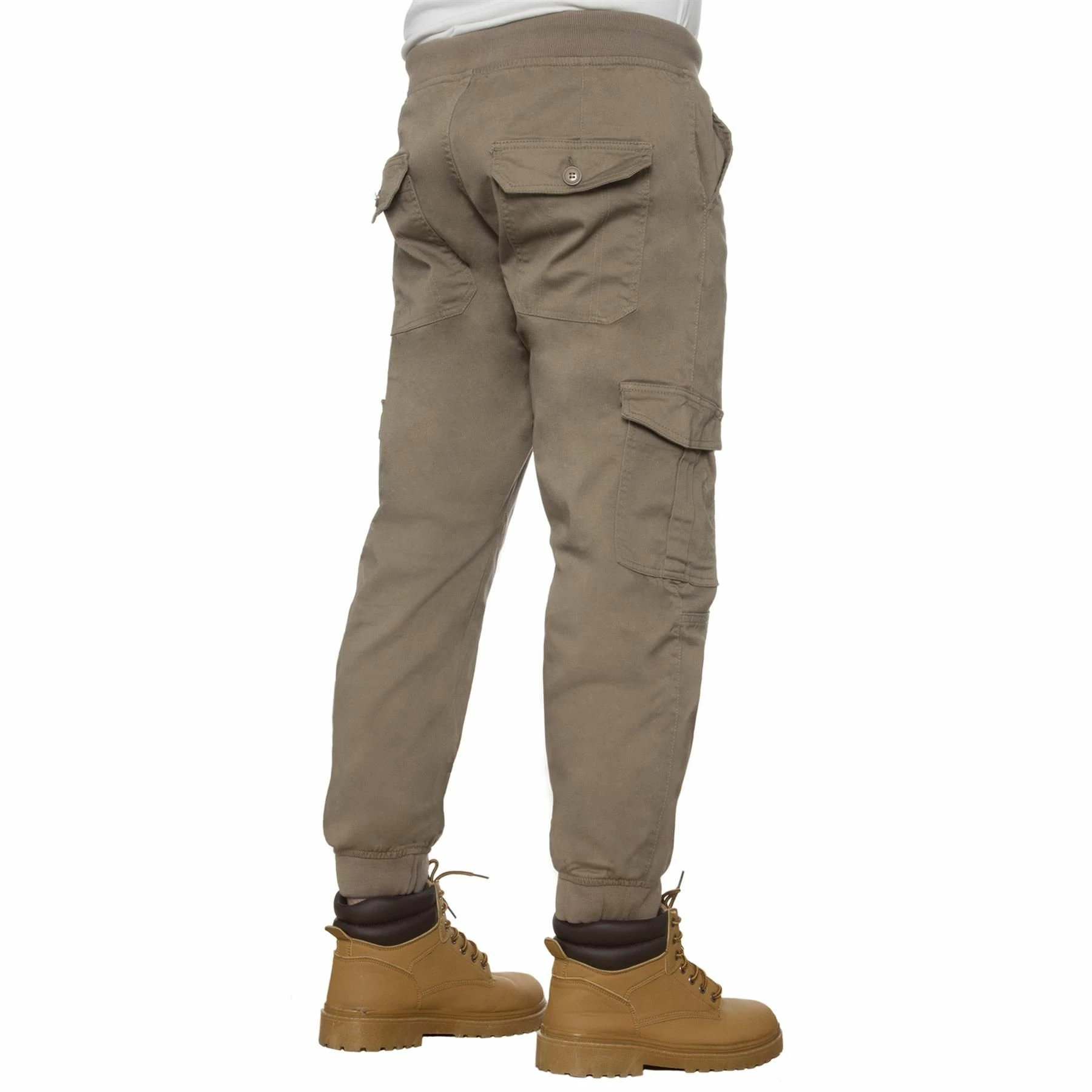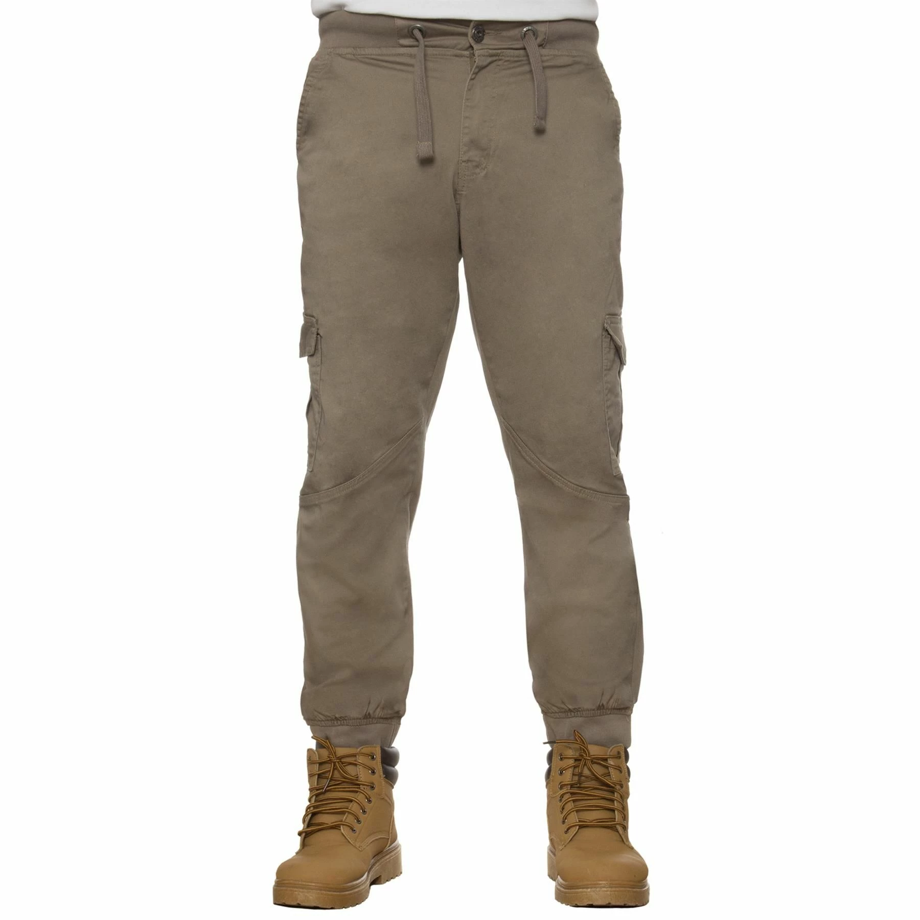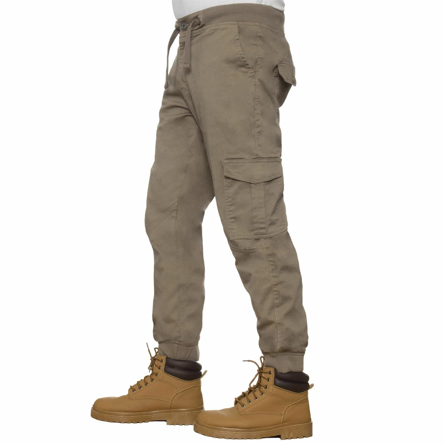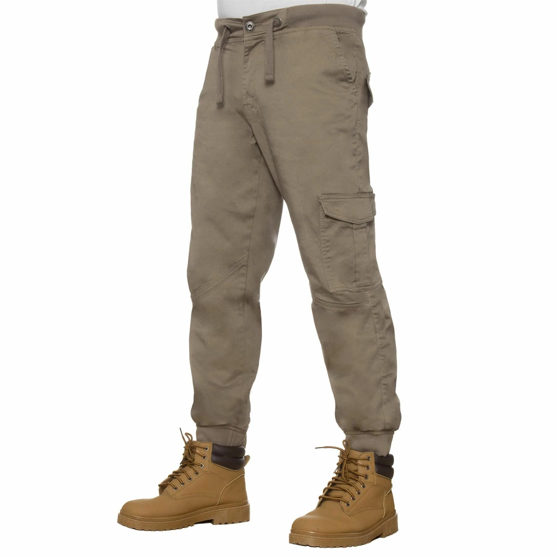 Ze Enzo Mens Combat Cuffed Jogger Style Jeans In Beige, Waist with stretch for added comfort, 98% Cotton, 2% Elastane, Zip Fly Fastening, 6 Pocket design Including 2 side Velcro flap pockets and Button Back Pockets, Mid Rise, Elasticated Ribbed Waist and Cuffs, Adjustable Drawstrings and Branded Buttons, Machine washable, For All Year Round wear And Casual Occasions.